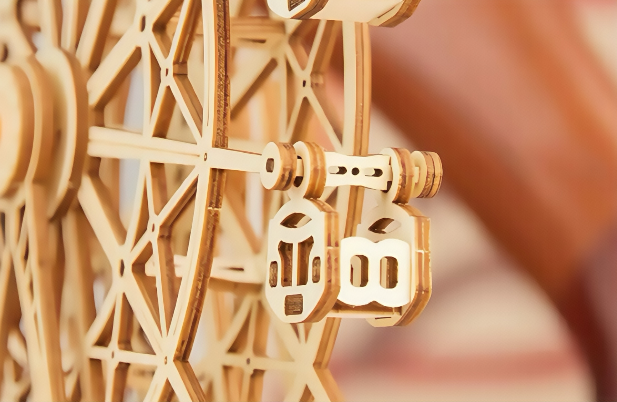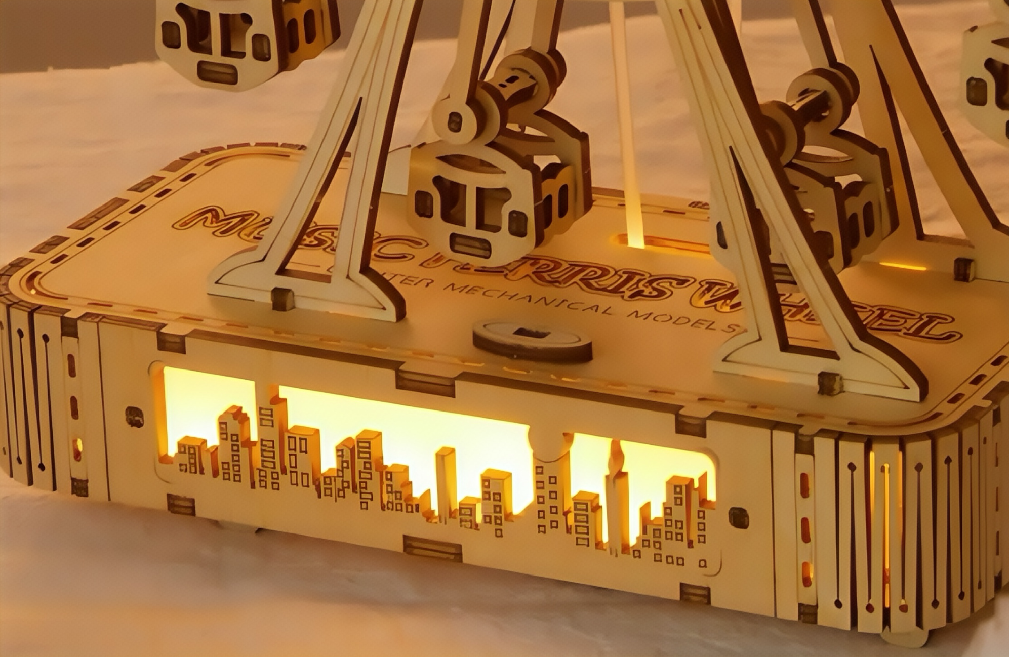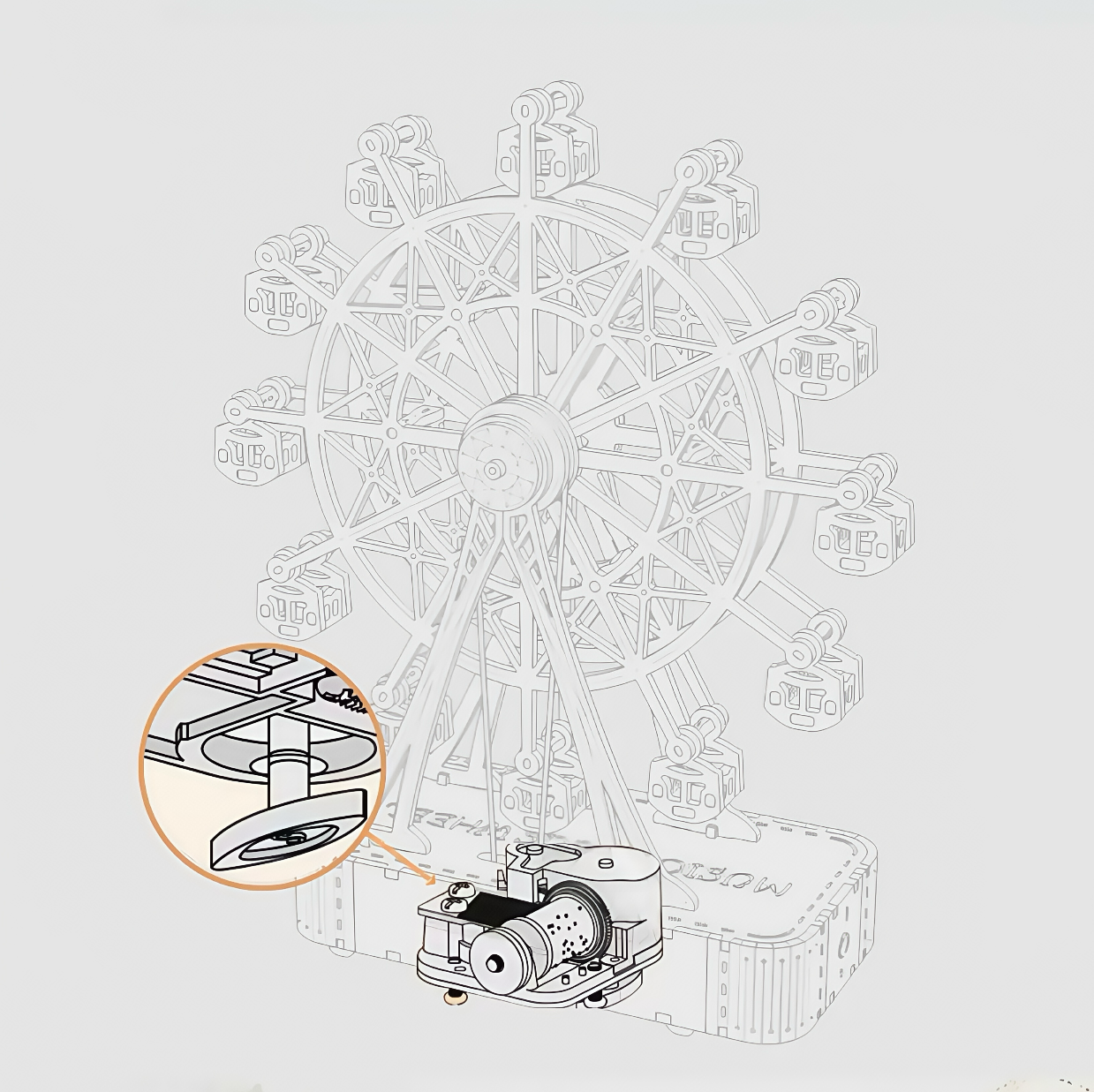 The Ferris Wheel Music Box is a 3D wooden puzzle that combines visual art with musical interactivity. Made from eco-friendly laser-cut wood, assembling this model is both enjoyable and engaging. Once completed, the Ferris wheel spins and plays a delightful tune, making it a heartfelt gift and a beautiful expression of romance and emotion.